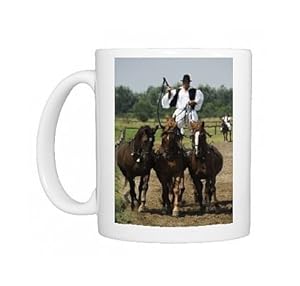 Product Description : Size: Photo MugPhoto Mug showing Hungarian cowboy horse show. Hungarian cowboy horse show, Bugaci Town, Kiskunsagi National Park, Hungary, Europe. Chosen by Robert Harding. 11oz White ceramic coffee mug. Image printed using sublimation ink process. Microwave, dishwasher safe. This item is shipped from our American lab.